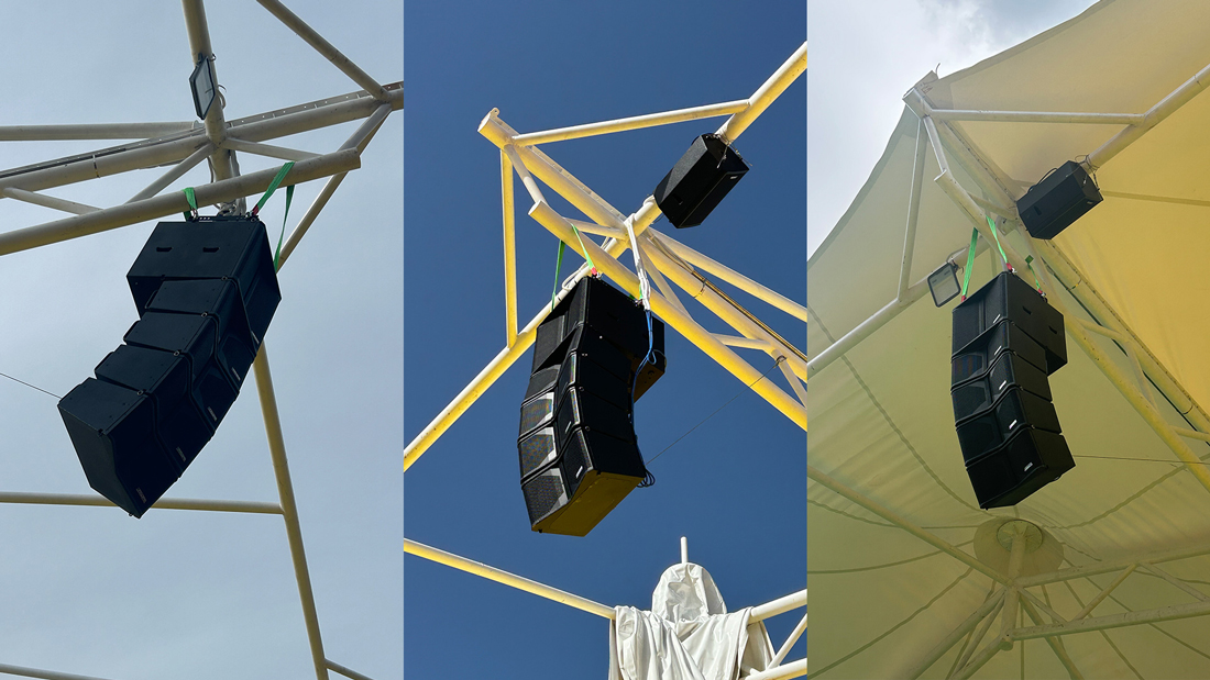 The line array speakers are evenly deployed across the stands to provide primary coverage, while the full-range speakers are strategically distributed throughout the seating areas to ensure uniform sound across the entire venue.